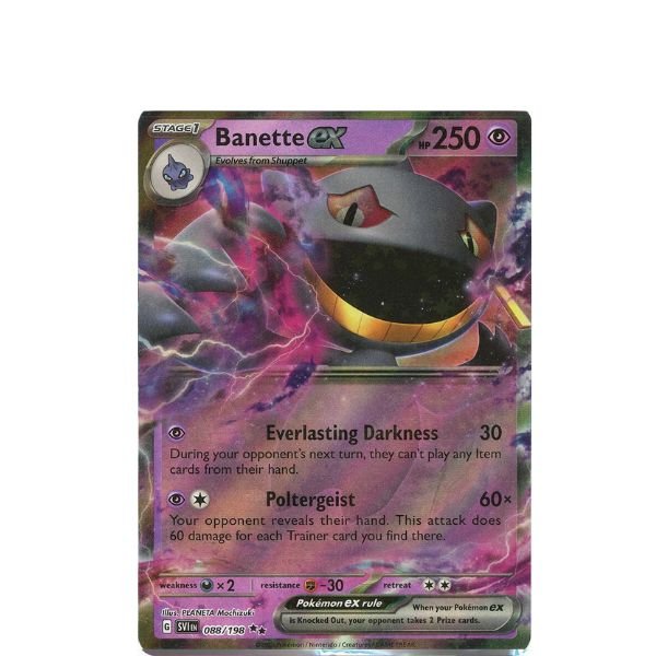 Pokemon Pokemon Banette ex 088/198 Scarlet & Violet is een opvallende en stijlvolle ex kaart die zowel verzamelaars als spelers van het Pokemon TCG zal aanspreken. Deze kaart combineert een uniek, donker design met de kracht die je van een ex kaart mag verwachten, waardoor hij direct een waardevolle toevoeging is aan elke collectie of elk speeldeck.