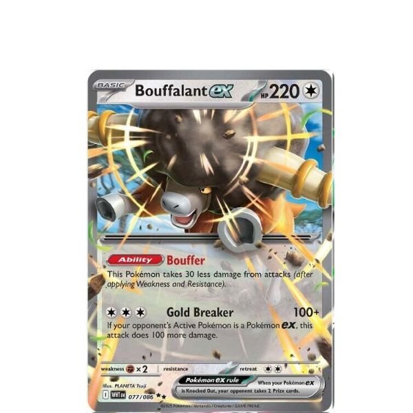 Binnen het Pokemon TCG vertegenwoordigt Bouffalant het archetype van brute kracht en standvastigheid. Waar sommige Pokemon vertrouwen op snelheid of speciale energie, draait het bij Bouffalant om fysieke dominantie en uithoudingsvermogen. De Bouffalant ex 77/86 White Flare kaart vertaalt dit concept uitstekend naar een indrukwekkend ontwerp.