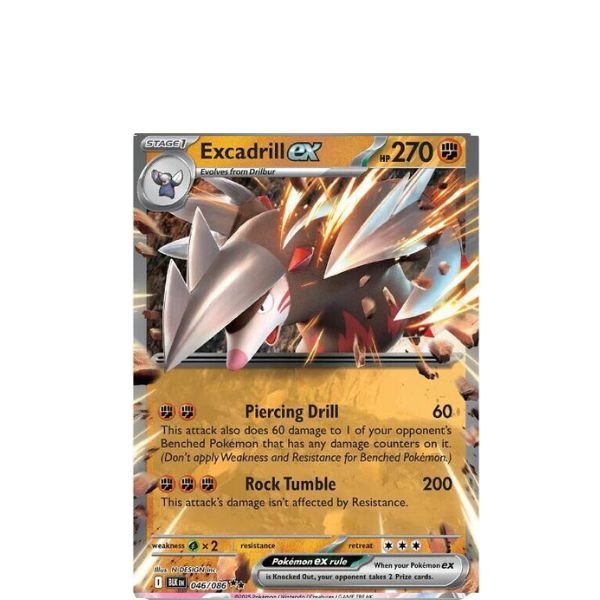 Excadrill ex 46/86 Black Bolt is een krachtige en stoere toevoeging aan iedere Pokemon kaarten verzameling. Excadrill staat bekend om zijn snelheid, fysieke kracht en onstuitbare graafcapaciteiten. Als Ground en Steel type Pokemon straalt hij pure kracht en vastberadenheid uit, wat perfect tot uiting komt in deze ex uitvoering uit de Black Bolt set.