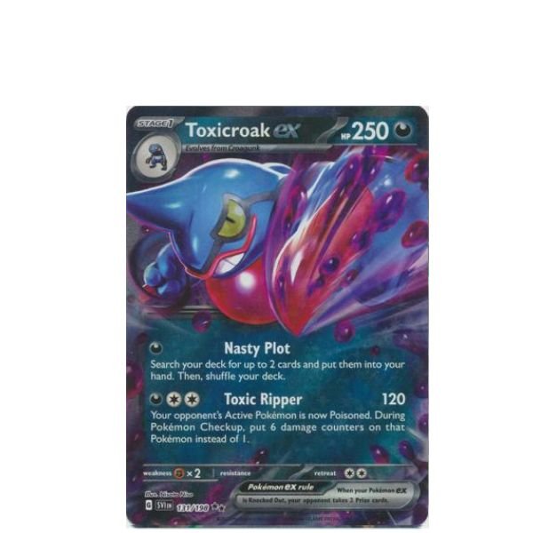 In het Pokemon TCG draait het soms om meer dan directe schade. Met Toxicroak 131/189 Scarlet en Violet breng je een nieuwe dimensie naar je spel: vergiftiging. Deze kaart is gebouwd op het uithollen van je tegenstander over meerdere beurten. Zijn aanval “Toxic Punch” doet niet alleen damage, maar laat je tegenstander ook achter met de Poison-status, wat continu schade veroorzaakt zolang deze actief is.